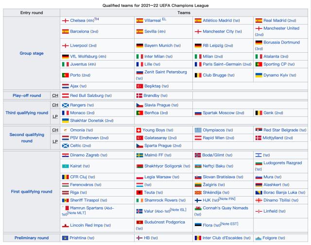 2021-22赛季欧冠第一轮资格赛预选赛6月22日开打,资格赛附加赛8月25日结束,小组赛抽签将于8月26号举行。